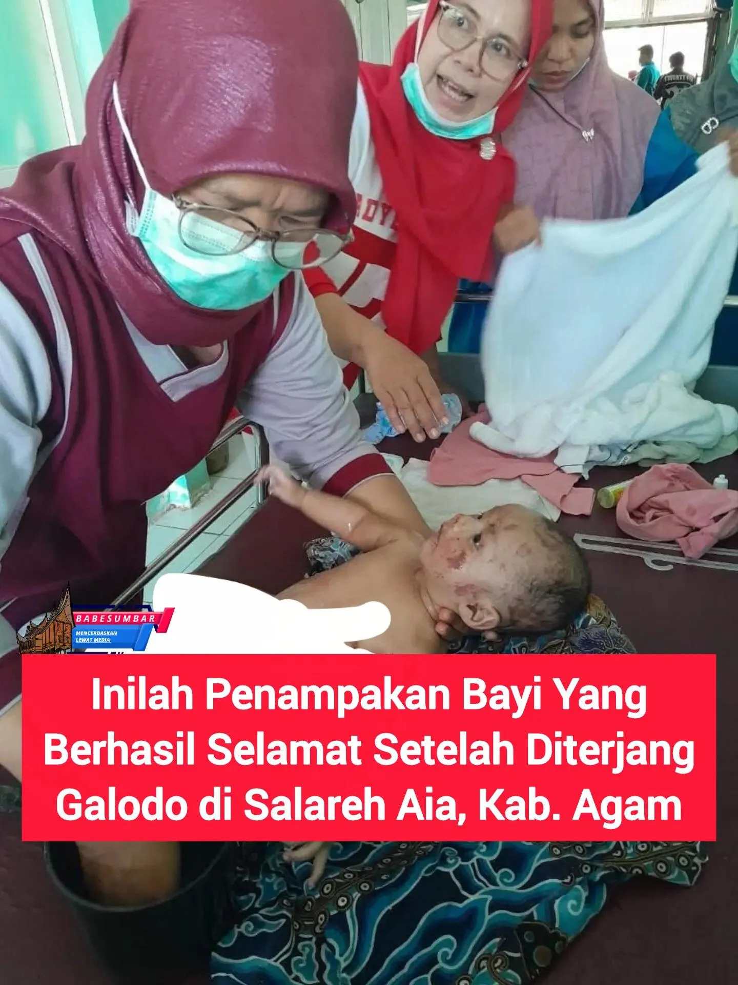 Kisah pilu dirasakan oleh Bayi berusia 4 bulan ini selamat dari banjir bandang yang melanda Kabupaten Agam, Sumatera Barat. Ia ditemukan terbaring di atas tumpukan jerami, sementara kedua orang tuanya ditemukan meninggal karena terseret arus.
